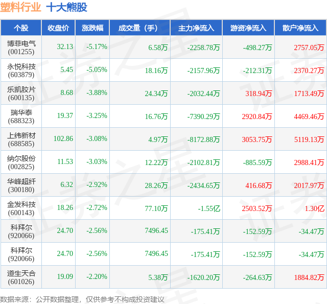 个股表现方面,塑料行业当日领跌股为博菲电气(001255),该股当日报收32.13,下跌5.17%,成交量6.58万,主力资金净流出2258.78万元。永悦科技(603879)以下跌5.05%紧随其后,该股当日成交量18.16万,主力资金净流出2157.96万元。除此之外,乐凯胶片(600135)、瑞华泰(688323)、上纬新材(688585)均进入当日熊股之列。具体个股列表见下表: