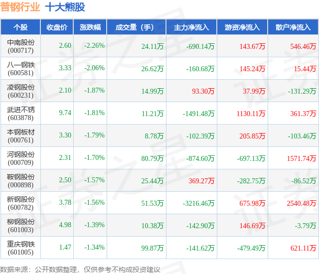 个股表现方面,普钢行业当日领跌股为中南股份(000717),该股当日报收2.6,下跌2.26%,成交量24.11万,主力资金净流出690.14万元。八一钢铁(600581)以下跌2.06%紧随其后,该股当日成交量26.62万,主力资金净流出160.68万元。除此之外,凌钢股份(600231)、武进不锈(603878)、本钢板材(000761)均进入当日熊股之列。具体个股列表见下表: