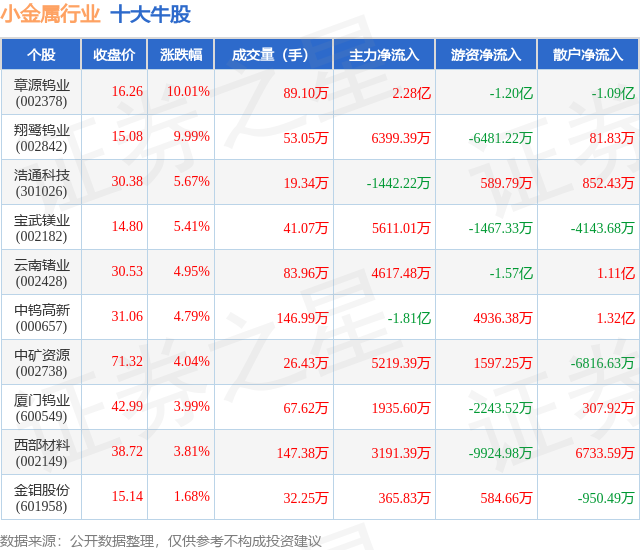 个股表现方面,小金属行业当日领涨股为章源钨业(002378),该股当日报收16.26,上涨10.01%,成交量89.1万,主力资金净流入2.28亿元。翔鹭钨业(002842)以上涨9.99%紧随其后,该股当日成交量53.05万,主力资金净流入6399.39万元。除此之外,浩通科技(301026)、宝武镁业(002182)、云南锗业(002428)均进入当日牛股之列。具体个股列表见下表: