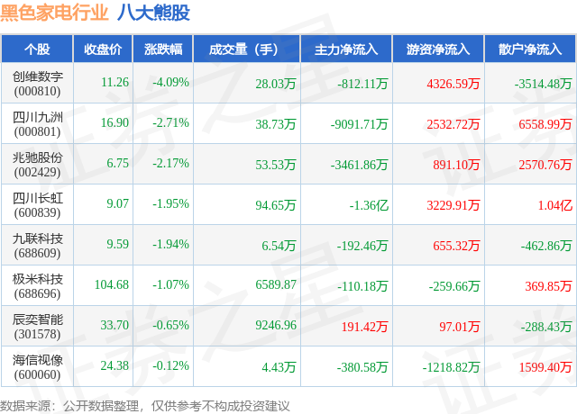 个股表现方面,黑色家电行业当日领跌股为创维数字(000810),该股当日报收11.26,下跌4.09%,成交量28.03万,主力资金净流出812.11万元。四川九洲(000801)以下跌2.71%紧随其后,该股当日成交量38.73万,主力资金净流出9091.71万元。除此之外,兆驰股份(002429)、四川长虹(600839)、九联科技(688609)均进入当日熊股之列。具体个股列表见下表:
