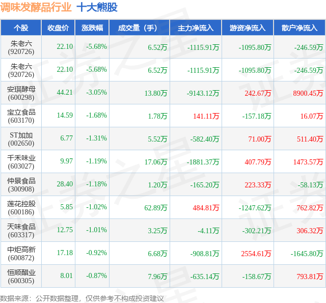 个股表现方面,调味发酵品行业当日领跌股为朱老六(920726),该股当日报收22.1,下跌5.68%,成交量6.52万,主力资金净流出1115.91万元。朱老六(920726)以下跌5.68%紧随其后,该股当日成交量6.52万,主力资金净流出1115.91万元。除此之外,安琪酵母(600298)、宝立食品(603170)、ST加加(002650)均进入当日熊股之列。具体个股列表见下表: