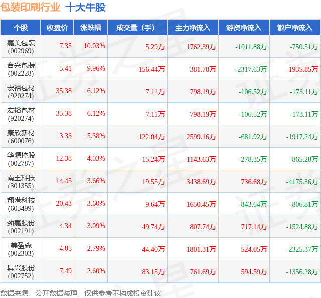 个股表现方面,包装印刷行业当日领涨股为嘉美包装(002969),该股当日报收7.35,上涨10.03%,成交量5.29万,主力资金净流入1762.39万元。合兴包装(002228)以上涨9.96%紧随其后,该股当日成交量156.44万,主力资金净流入381.78万元。除此之外,宏裕包材(920274)、宏裕包材(920274)、康欣新材(600076)均进入当日牛股之列。具体个股列表见下表: