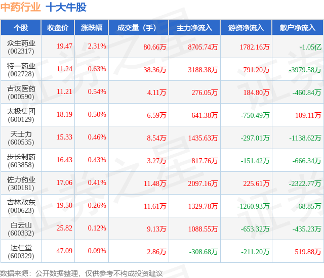 个股表现方面,中药行业当日领涨股为众生药业(002317),该股当日报收19.47,上涨2.31%,成交量80.66万,主力资金净流入8705.74万元。特一药业(002728)以上涨0.63%紧随其后,该股当日成交量38.36万,主力资金净流入3188.38万元。除此之外,古汉医药(000590)、太极集团(600129)、天士力(600535)均进入当日牛股之列。具体个股列表见下表: