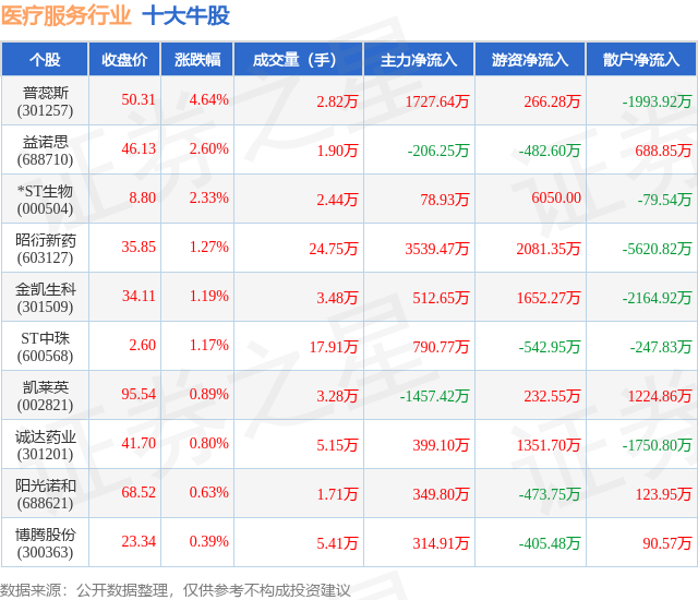 个股表现方面,医疗服务行业当日领涨股为普蕊斯(301257),该股当日报收50.31,上涨4.64%,成交量2.82万,主力资金净流入1727.64万元。益诺思(688710)以上涨2.6%紧随其后,该股当日成交量1.9万,主力资金净流出206.25万元。除此之外,*ST生物(000504)、昭衍新药(603127)、金凯生科(301509)均进入当日牛股之列。具体个股列表见下表: