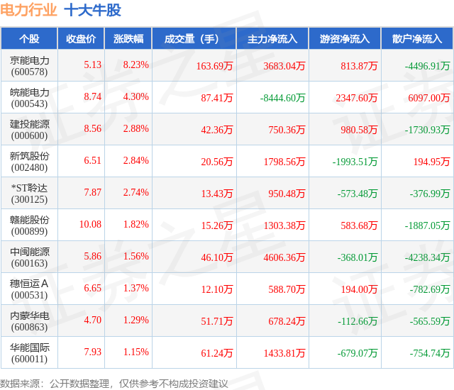 个股表现方面,电力行业当日领涨股为京能电力(600578),该股当日报收5.13,上涨8.23%,成交量163.69万,主力资金净流入3683.04万元。皖能电力(000543)以上涨4.3%紧随其后,该股当日成交量87.41万,主力资金净流出8444.6万元。除此之外,建投能源(000600)、新筑股份(002480)、*ST聆达(300125)均进入当日牛股之列。具体个股列表见下表: