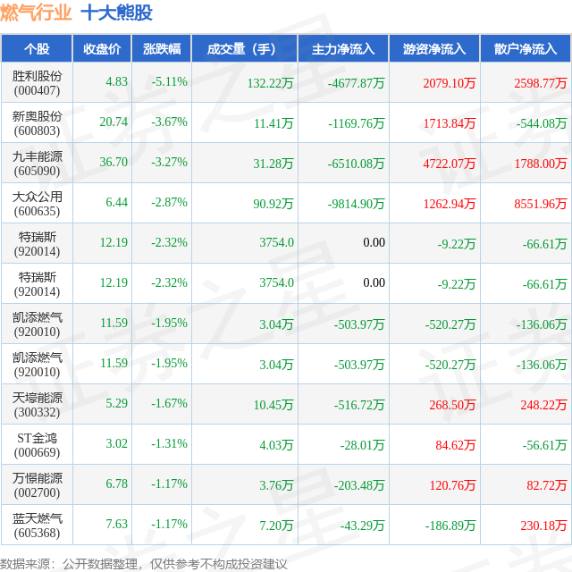个股表现方面,燃气行业当日领跌股为胜利股份(000407),该股当日报收4.83,下跌5.11%,成交量132.22万,主力资金净流出4677.87万元。新奥股份(600803)以下跌3.67%紧随其后,该股当日成交量11.41万,主力资金净流出1169.76万元。除此之外,九丰能源(605090)、大众公用(600635)、特瑞斯(920014)均进入当日熊股之列。具体个股列表见下表: