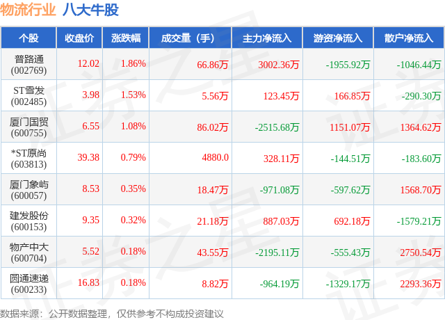 个股表现方面,物流行业当日领涨股为普路通(002769),该股当日报收12.02,上涨1.86%,成交量66.86万,主力资金净流入3002.36万元。ST雪发(002485)以上涨1.53%紧随其后,该股当日成交量5.56万,主力资金净流入123.45万元。除此之外,厦门国贸(600755)、*ST原尚(603813)、厦门象屿(600057)均进入当日牛股之列。具体个股列表见下表: