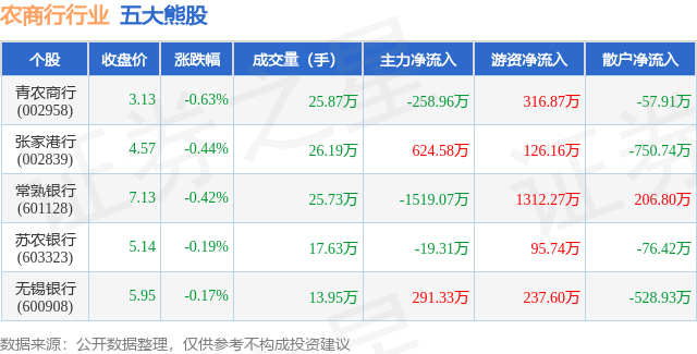 个股表现方面,农商行行业当日领跌股为青农商行(002958),该股当日报收3.13,下跌0.63%,成交量25.87万,主力资金净流出258.96万元。张家港行(002839)以下跌0.44%紧随其后,该股当日成交量26.19万,主力资金净流入624.58万元。除此之外,常熟银行(601128)、苏农银行(603323)、无锡银行(600908)均进入当日熊股之列。具体个股列表见下表: