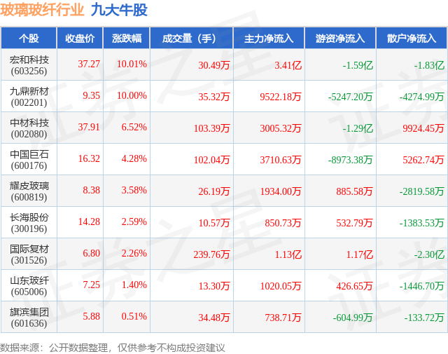个股表现方面,玻璃玻纤行业当日领涨股为宏和科技(603256),该股当日报收37.27,上涨10.01%,成交量30.49万,主力资金净流入3.41亿元。九鼎新材(002201)以上涨10.0%紧随其后,该股当日成交量35.32万,主力资金净流入9522.18万元。除此之外,中材科技(002080)、中国巨石(600176)、耀皮玻璃(600819)均进入当日牛股之列。具体个股列表见下表:
