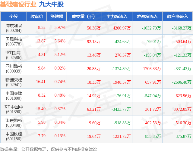 个股表现方面,基础建设行业当日领涨股为浦东建设(600284),该股当日报收8.52,上涨5.97%,成交量50.36万,主力资金净流入4200.97万元。国晟科技(603778)以上涨5.64%紧随其后,该股当日成交量92.13万,主力资金净流出424.63万元。除此之外,ST围海(002586)、四川路桥(600039)、新疆交建(002941)均进入当日牛股之列。具体个股列表见下表: