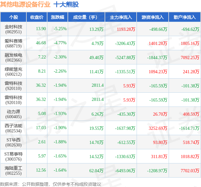 个股表现方面,其他电源设备行业当日领跌股为金时科技(002951),该股当日报收13.9,下跌5.25%,成交量13.29万,主力资金净流入1193.28万元。爱科赛博(688719)以下跌4.77%紧随其后,该股当日成交量4.79万,主力资金净流出3206.43万元。除此之外,融发核电(002366)、绿能慧充(600212)、雷特科技(920110)均进入当日熊股之列。具体个股列表见下表: