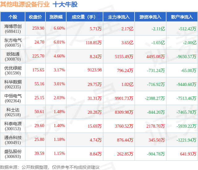 个股表现方面,其他电源设备行业当日领涨股为海博思创(688411),该股当日报收259.9,上涨6.6%,成交量5.71万,主力资金净流入2.17亿元。东方电气(600875)以上涨6.01%紧随其后,该股当日成交量118.85万,主力资金净流入3.65亿元。除此之外,欧陆通(300870)、优优绿能(301590)、科华数据(002335)均进入当日牛股之列。具体个股列表见下表: