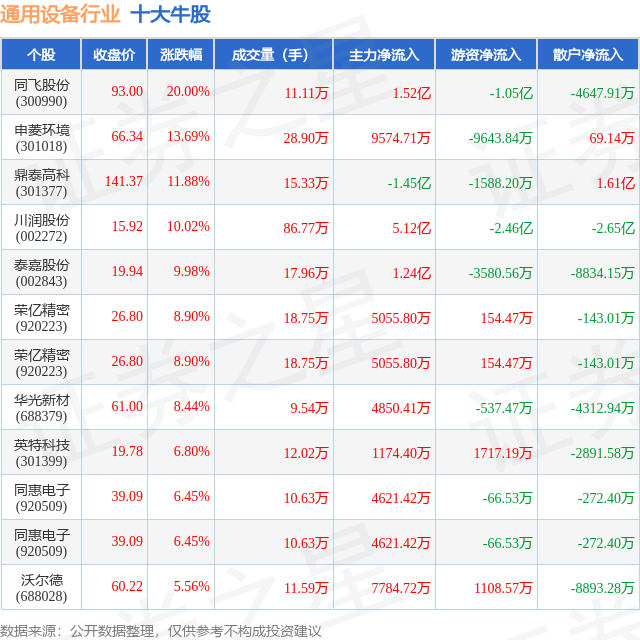 个股表现方面,通用设备行业当日领涨股为同飞股份(300990),该股当日报收93.0,上涨20.0%,成交量11.11万,主力资金净流入1.52亿元。申菱环境(301018)以上涨13.69%紧随其后,该股当日成交量28.9万,主力资金净流入9574.71万元。除此之外,鼎泰高科(301377)、川润股份(002272)、泰嘉股份(002843)均进入当日牛股之列。具体个股列表见下表: