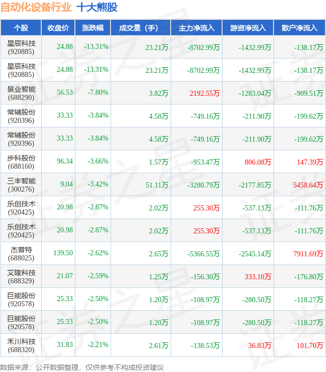 个股表现方面,自动化设备行业当日领跌股为星辰科技(920885),该股当日报收24.88,下跌13.31%,成交量23.21万,主力资金净流出8702.99万元。星辰科技(920885)以下跌13.31%紧随其后,该股当日成交量23.21万,主力资金净流出8702.99万元。除此之外,景业智能(688290)、常辅股份(920396)、常辅股份(920396)均进入当日熊股之列。具体个股列表见下表: