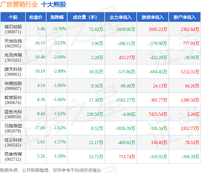 个股表现方面,广告营销行业当日领跌股为福石控股(300071),该股当日报收5.46,下跌3.7%,成交量72.42万,主力资金净流出5058.06万元。天地在线(002995)以下跌3.12%紧随其后,该股当日成交量3.96万,主力资金净流出206.11万元。除此之外,兆讯传媒(301102)、旗天科技(300061)、华媒控股(000607)均进入当日熊股之列。具体个股列表见下表: