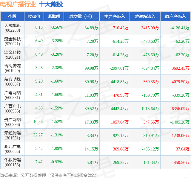 个股表现方面,电视广播行业当日领跌股为天威视讯(002238),该股当日报收8.13,下跌3.56%,成交量34.89万,主力资金净流入710.42万元。流金科技(920021)以下跌3.28%紧随其后,该股当日成交量7.2万,主力资金净流出614.23万元。除此之外,流金科技(920021)、吉视传媒(601929)、东方明珠(600637)均进入当日熊股之列。具体个股列表见下表: