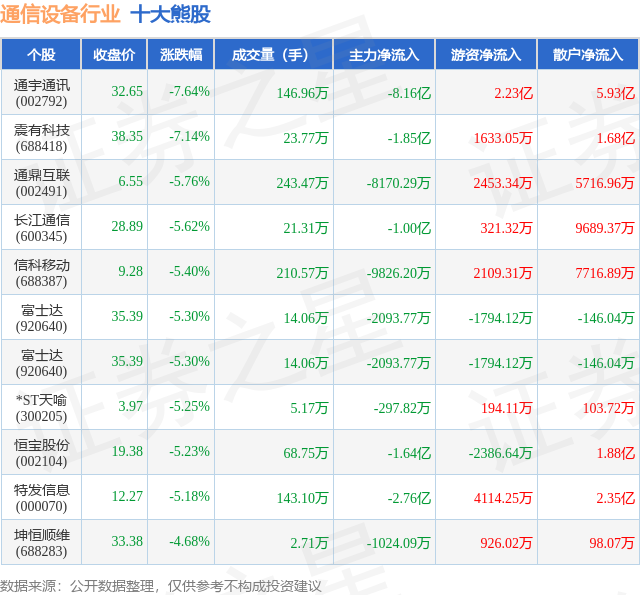 个股表现方面,通信设备行业当日领跌股为通宇通讯(002792),该股当日报收32.65,下跌7.64%,成交量146.96万,主力资金净流出8.16亿元。震有科技(688418)以下跌7.14%紧随其后,该股当日成交量23.77万,主力资金净流出1.85亿元。除此之外,通鼎互联(002491)、长江通信(600345)、信科移动(688387)均进入当日熊股之列。具体个股列表见下表: