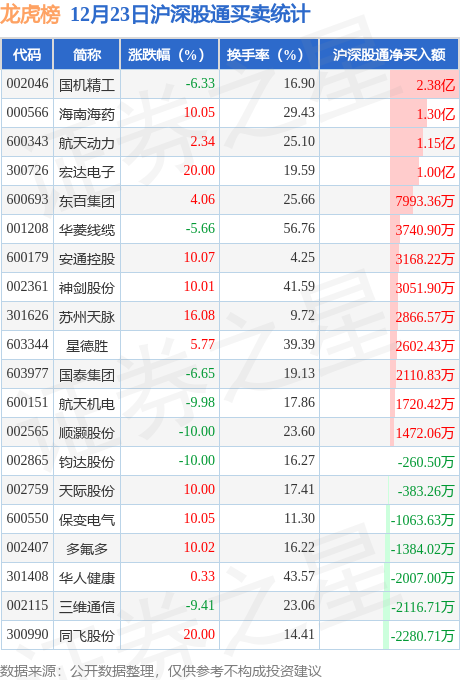 龙虎榜中有沪股通/深股通专用席位(北向资金)现身的个股共25家,其中国机精工以净买入2.38亿元排名第一。详情见下表: