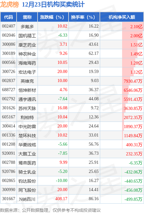当日公布的交易所龙虎榜中有机构专用席位现身的个股共35家,其中多氟多以净买入2.1亿元排名第一。详情见下表: