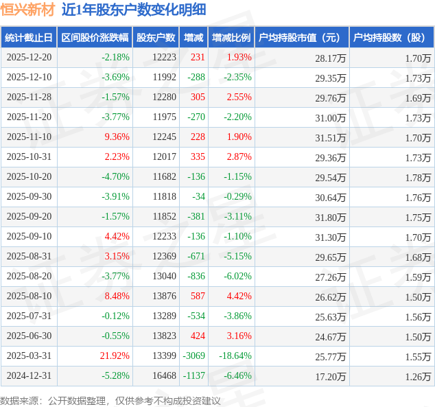 从股价来看,2025年12月10日至2025年12月20日,恒兴新材区间跌幅为2.18%,在此期间股东户数增加231.0户,增幅为1.93%。