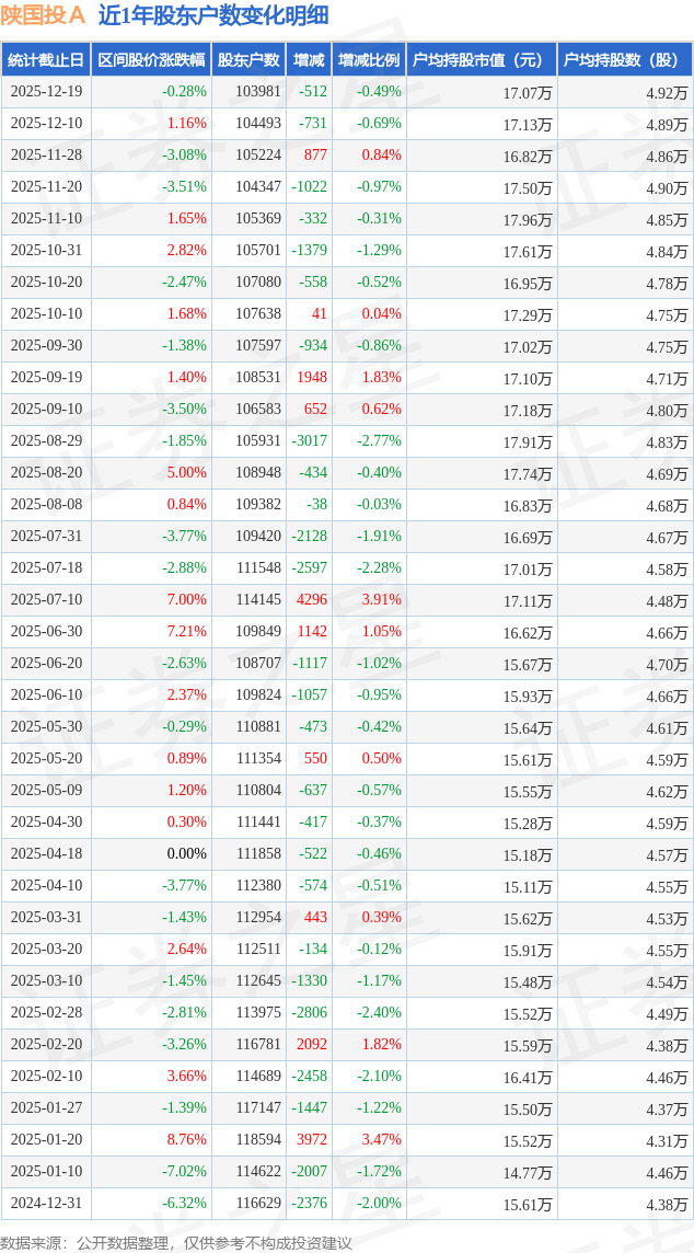 从股价来看,2025年12月10日至2025年12月19日,陕国投A区间跌幅为0.28%,在此期间股东户数减少512.0户,减幅为0.49%。