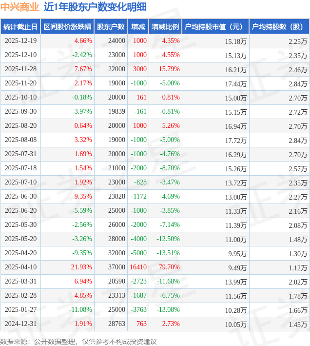 证券之星消息,近日中兴商业披露,截至2025年12月19日公司股东户数为2.4万户,较12月10日增加1000.0户,增幅为4.35%。户均持股数量由上期的2.35万股减少至2.25万股,户均持股市值为15.18万元。