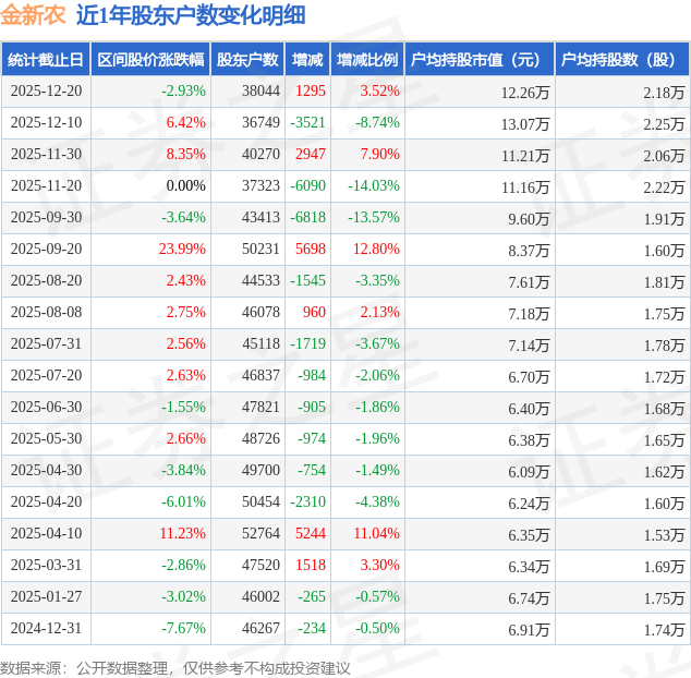 从股价来看,2025年12月10日至2025年12月20日,金新农区间跌幅为2.93%,在此期间股东户数增加1295.0户,增幅为3.52%。
