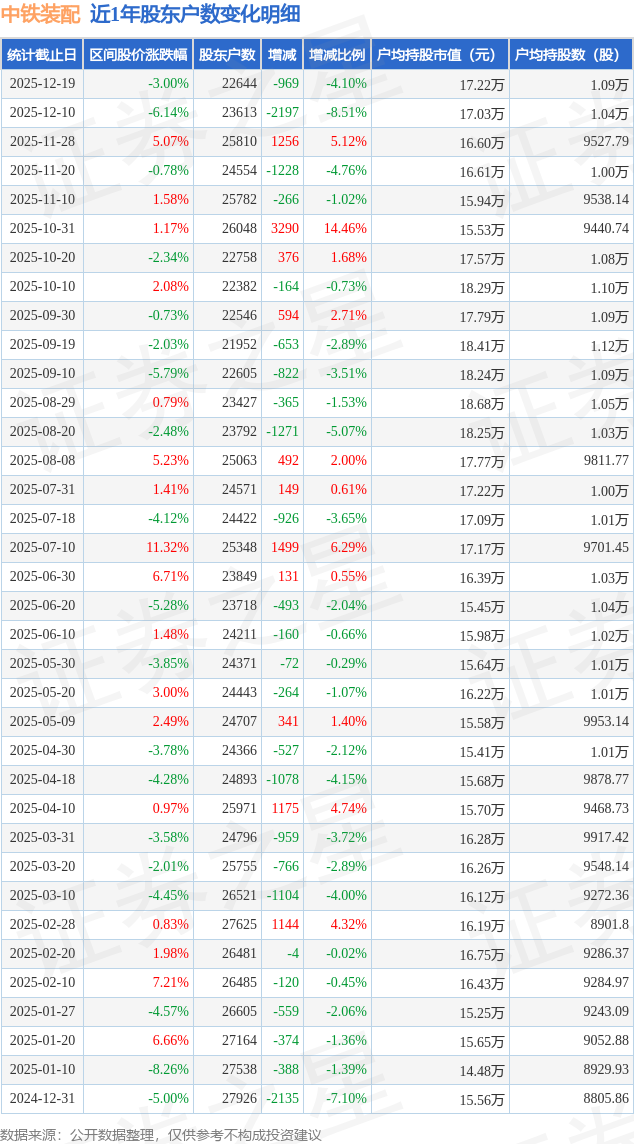 从股价来看,2025年12月10日至2025年12月19日,中铁装配区间跌幅为3.0%,在此期间股东户数减少969.0户,减幅为4.1%。