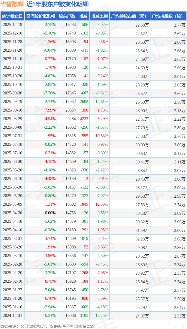 证券之星消息,近日华智数媒披露,截至2025年12月19日公司股东户数为1.62万户,较12月10日减少506.0户,减幅为3.02%。户均持股数量由上期的2.69万股增加至2.77万股,户均持股市值为22.58万元。