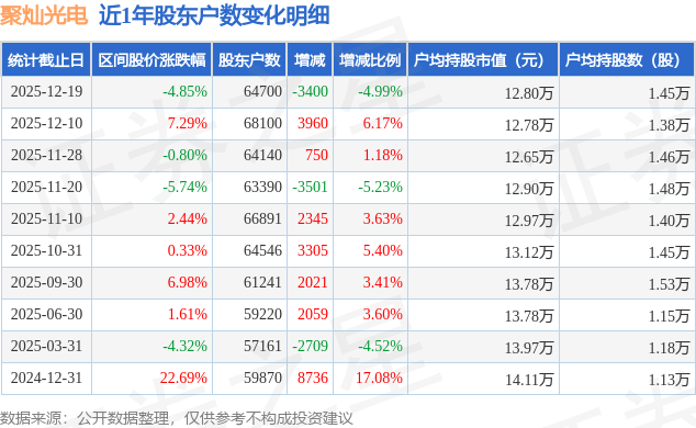 从股价来看,2025年12月10日至2025年12月19日,聚灿光电区间跌幅为4.85%,在此期间股东户数减少3400.0户,减幅为4.99%。