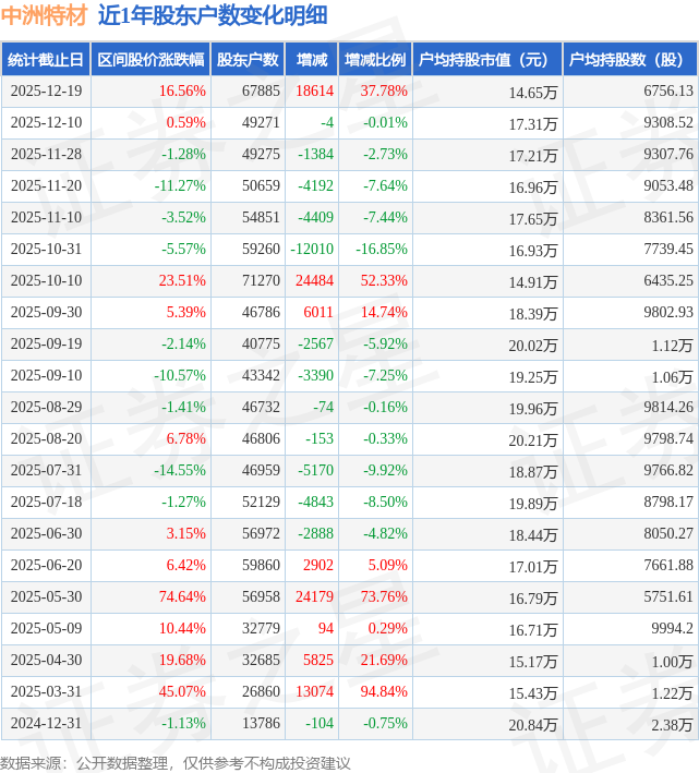 从股价来看,2025年12月10日至2025年12月19日,中洲特材区间涨幅为16.56%,在此期间股东户数增加1.86万户,增幅为37.78%。