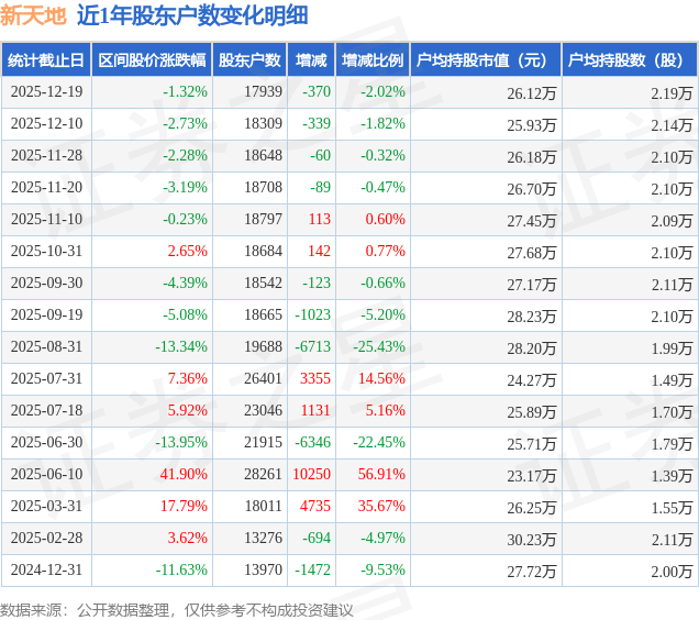 从股价来看,2025年12月10日至2025年12月19日,新天地区间跌幅为1.32%,在此期间股东户数减少370.0户,减幅为2.02%。