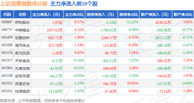 资金流向方面,上证消费(000036)指数成份股当日主力资金净流出合计7.74亿元,游资资金净流入合计3.33亿元,散户资金净流入合计4.41亿元。成份股资金流向详情见下表: