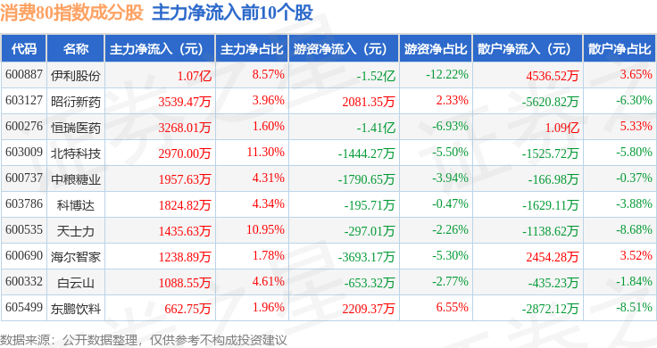 资金流向方面,消费80(000069)指数成份股当日主力资金净流出合计55.11亿元,游资资金净流入合计13.55亿元,散户资金净流入合计41.56亿元。成份股资金流向详情见下表: