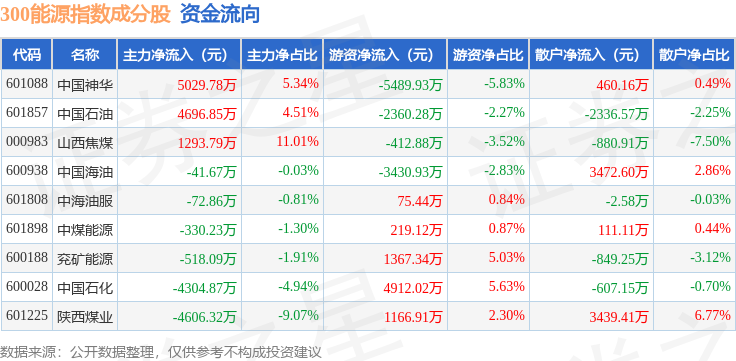 资金流向方面,300能源(000908)指数成份股当日主力资金净流入合计1146.38万元,游资资金净流出合计3953.21万元,散户资金净流入合计2806.82万元。成份股资金流向详情见下表: