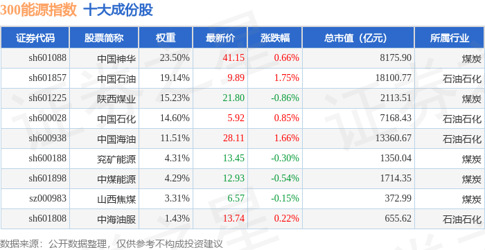 证券之星消息,12月23日,300能源(000908)指数报收于2326.75点,涨0.66%,成交53.07亿元,换手率0.13%。当日该指数成份股中,上涨的有5家,中国石油以1.75%的涨幅领涨,下跌的有4家,陕西煤业以0.86%的跌幅领跌。