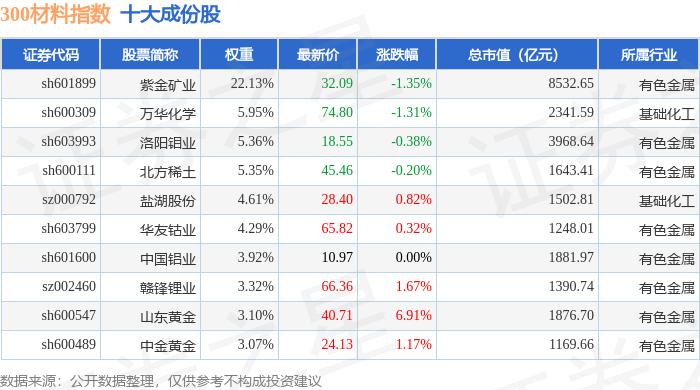 300材料(000909)指数十大成份股详情如下: