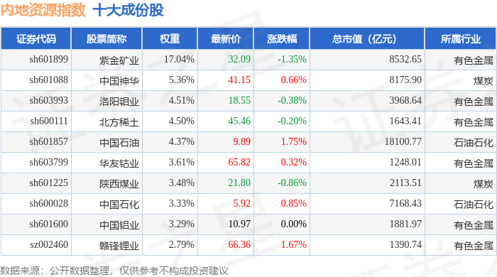内地资源(000944)指数十大成份股详情如下: