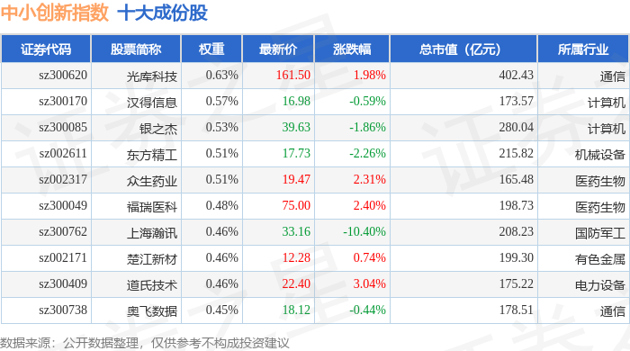 证券之星消息,12月23日,中小创新(399015)指数报收于2869.22点,跌0.43%,成交2010.61亿元,换手率3.11%。当日该指数成份股中,上涨的有135家,同飞股份以20.0%的涨幅领涨,下跌的有361家,上海瀚讯以10.4%的跌幅领跌。