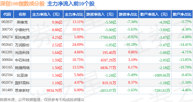 资金流向方面,深创100(399088)指数成份股当日主力资金净流出合计22.66亿元,游资资金净流入合计2621.24万元,散户资金净流入合计22.4亿元。成份股资金流向详情见下表: