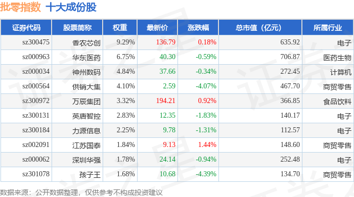 批零指数(399236)十大成份股详情如下: