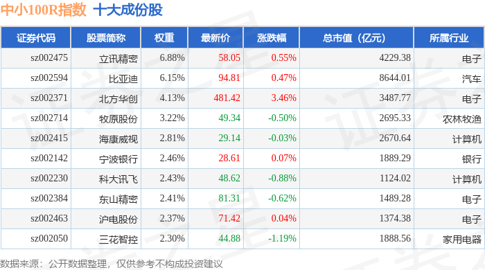 证券之星消息,12月23日,中小100R(399333)指数报收于9899.47点,涨0.35%,成交1183.5亿元,换手率1.46%。当日该指数成份股中,上涨的有42家,天赐材料以9.37%的涨幅领涨,下跌的有57家,航天电器以4.34%的跌幅领跌。