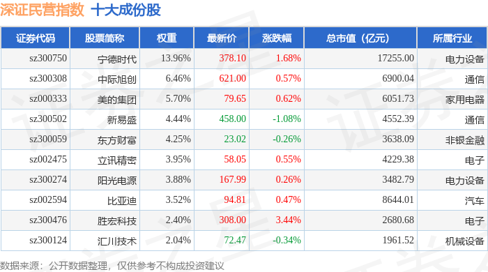深证民营(399337)指数十大成份股详情如下: