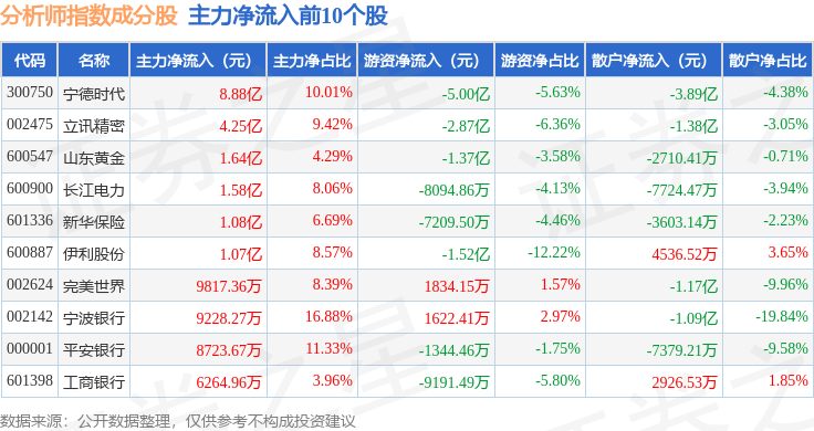 资金流向方面,分析师指数(399354)成份股当日主力资金净流出合计56.26亿元,游资资金净流入合计10.62亿元,散户资金净流入合计45.64亿元。成份股资金流向详情见下表: