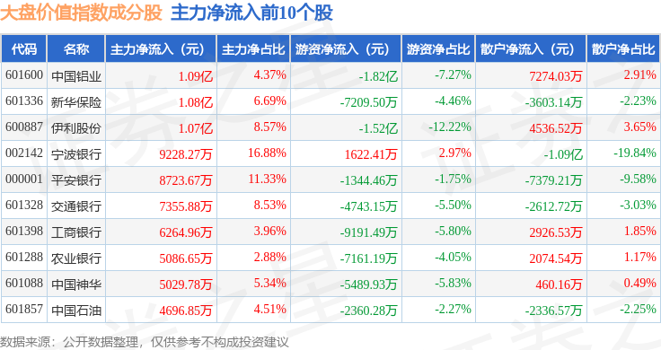 资金流向方面,大盘价值(399373)指数成份股当日主力资金净流出合计13.69亿元,游资资金净流入合计2.69亿元,散户资金净流入合计11.01亿元。成份股资金流向详情见下表: