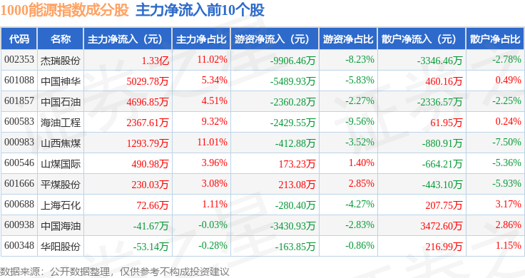 资金流向方面,1000能源(399381)指数成份股当日主力资金净流入合计1829.66万元,游资资金净流出合计8217.67万元,散户资金净流入合计6388.01万元。成份股资金流向详情见下表: