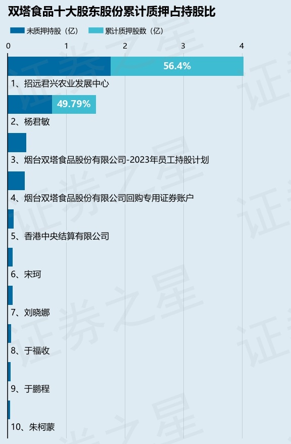截止本公告日,股东招远君兴农业发展中心已累计质押股份2.27亿股,占其持股总数的56.4%,股东杨君敏已累计质押股份7527.0万股,占其持股总数的49.79%。本次质押后双塔食品十大股东的累计质押股份占持股比例(占持股比例的计算以公司最新一期财务报表公布的十大股东的持股总数为基准)见下图: