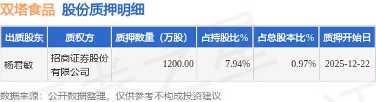 证券之星消息,双塔食品(002481)12月23日公开信息显示,股东杨君敏向招商证券股份有限公司合计质押1200.0万股,占总股本0.97%。质押详情见下表: