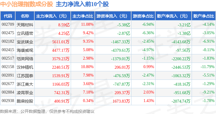资金流向方面,中小治理(399650)指数成份股当日主力资金净流出合计8.11亿元,游资资金净流出合计1.58亿元,散户资金净流入合计9.69亿元。成份股资金流向详情见下表:
