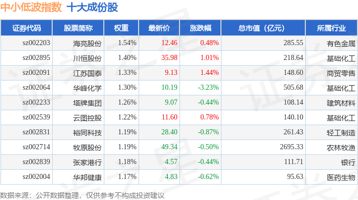 证券之星消息,12月23日,中小低波(399663)指数报收于1943.08点,跌0.53%,成交260.2亿元,换手率0.77%。当日该指数成份股中,上涨的有27家,双鹭药业以2.09%的涨幅领涨,下跌的有68家,华峰化学以3.23%的跌幅领跌。